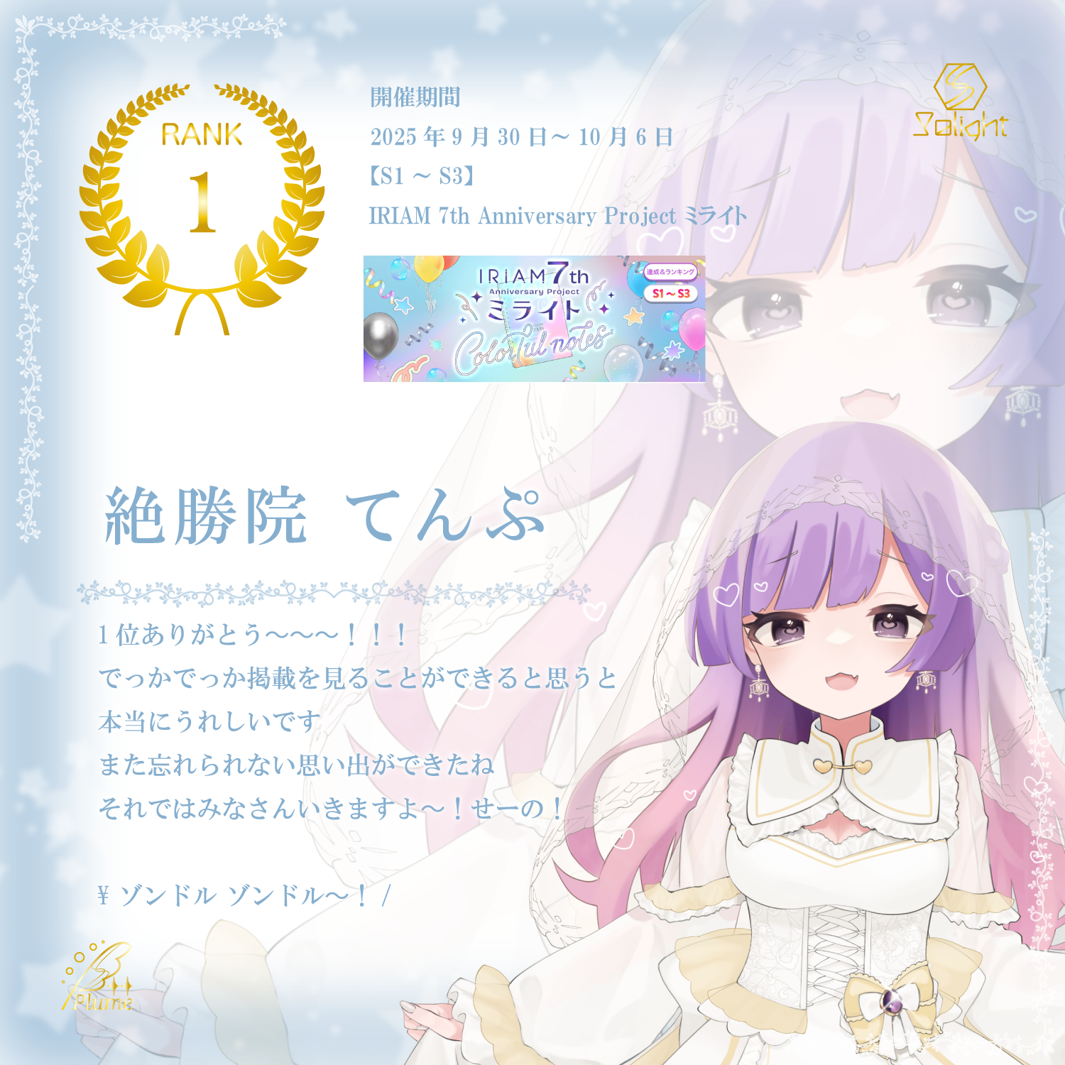 入賞情報 絶勝院てんぷがIRIAM「IRIAM 7th Anniversary Project ミライト(S1-S3)」で1位に入賞! Solight所属ライバー「絶勝院てんぷ」がライブ配信アプリ「IRIAM」の公式イベント「IRIAM 7th Anniversary Project ミライト(S1-S3)」で1位に入賞しました! 応援いただいた皆様ありがとうございました! 今後とも絶勝院てんぷをよろしくお願いいたします!